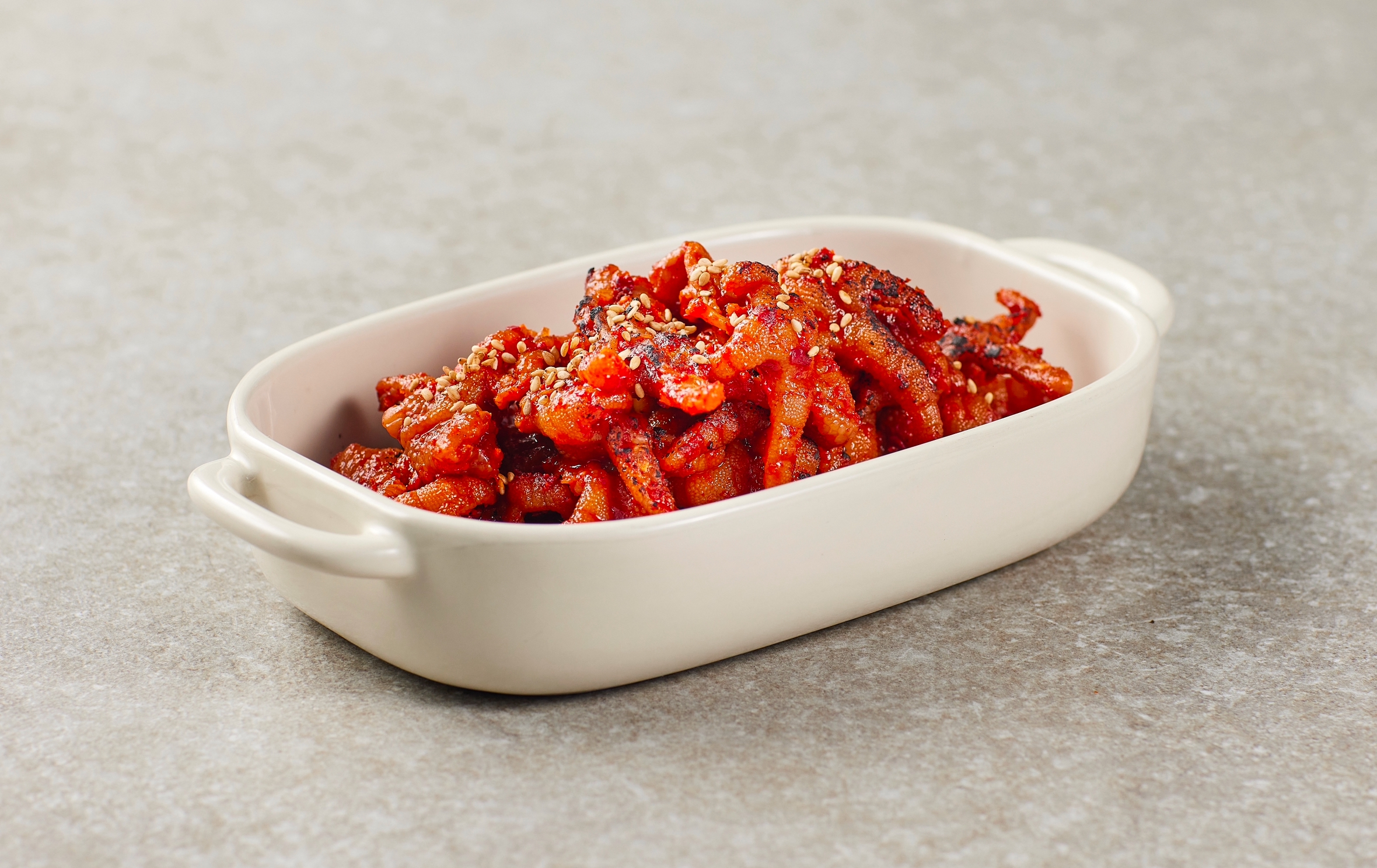 뼈가 없는 닭발에 매운맛이 강한 특제 양념을 버무려 재우고,